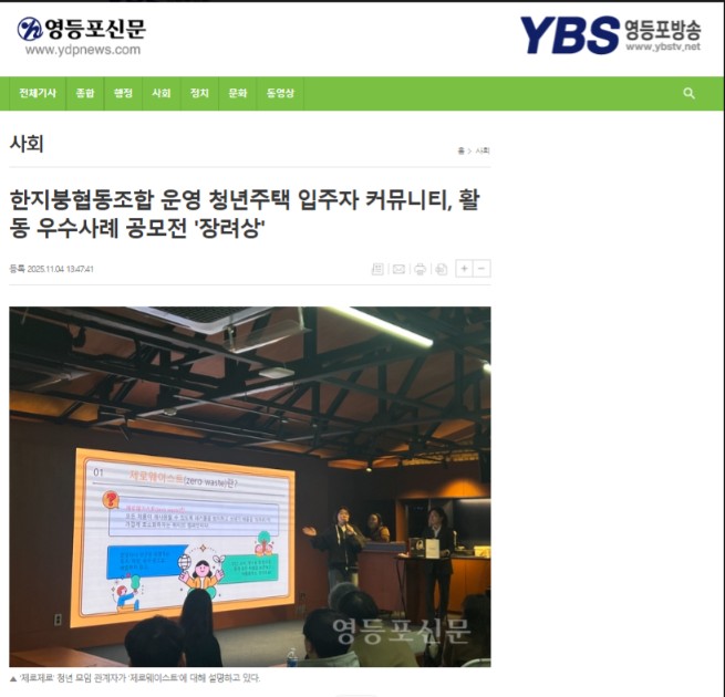 한지붕협동조합이 청년 주택 입주자들도 공모전에 참여한 바, 생활 쓰레기를 최소화시켜 환경을 보호하는 “제로웨이스트”를 실천하는 방이동 청년주택 동아리 「제로제로」 청년 모임이 장려상과 금일봉을 수상하게 되었습니다.