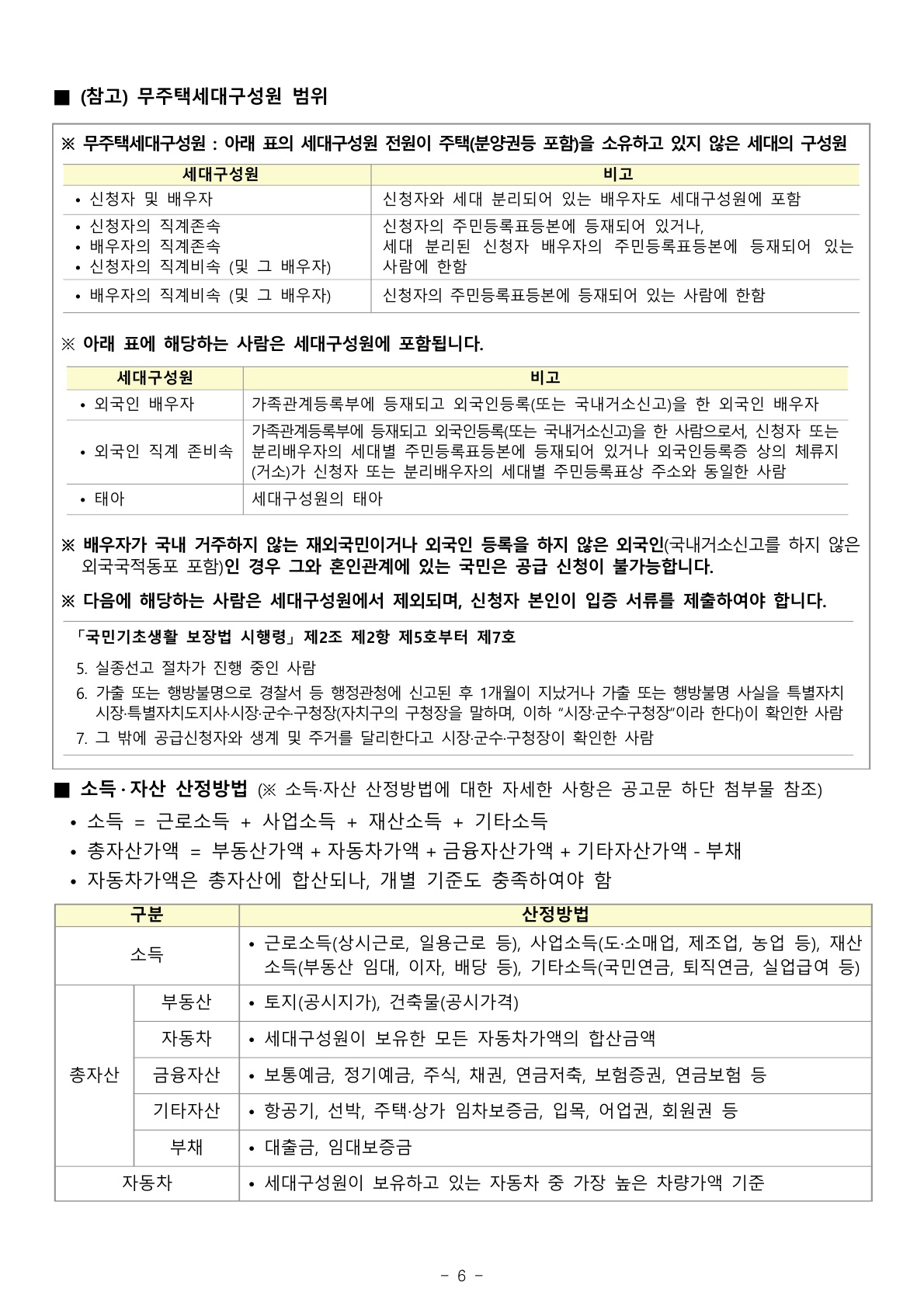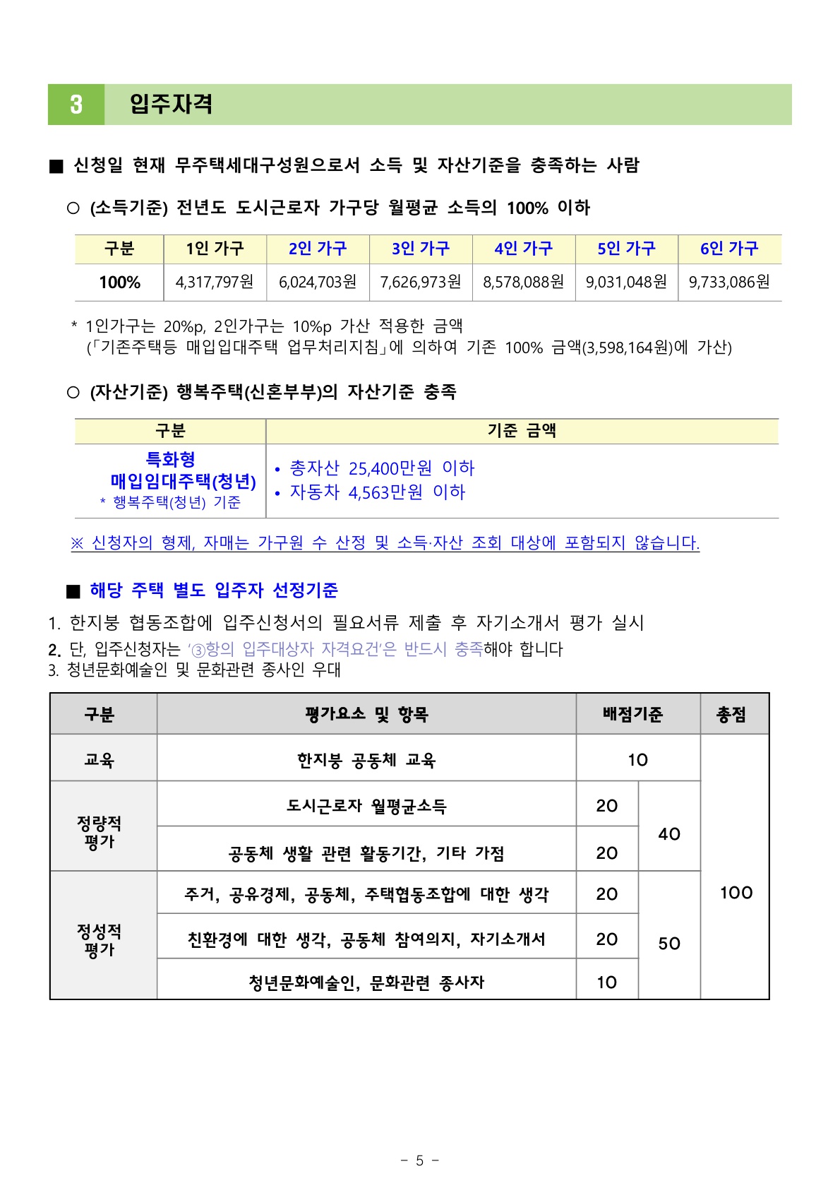 - 자산, 소득 기준 이하인 자 : 자세한 기준은 별첨한 "입주자모집공고문"을 확인