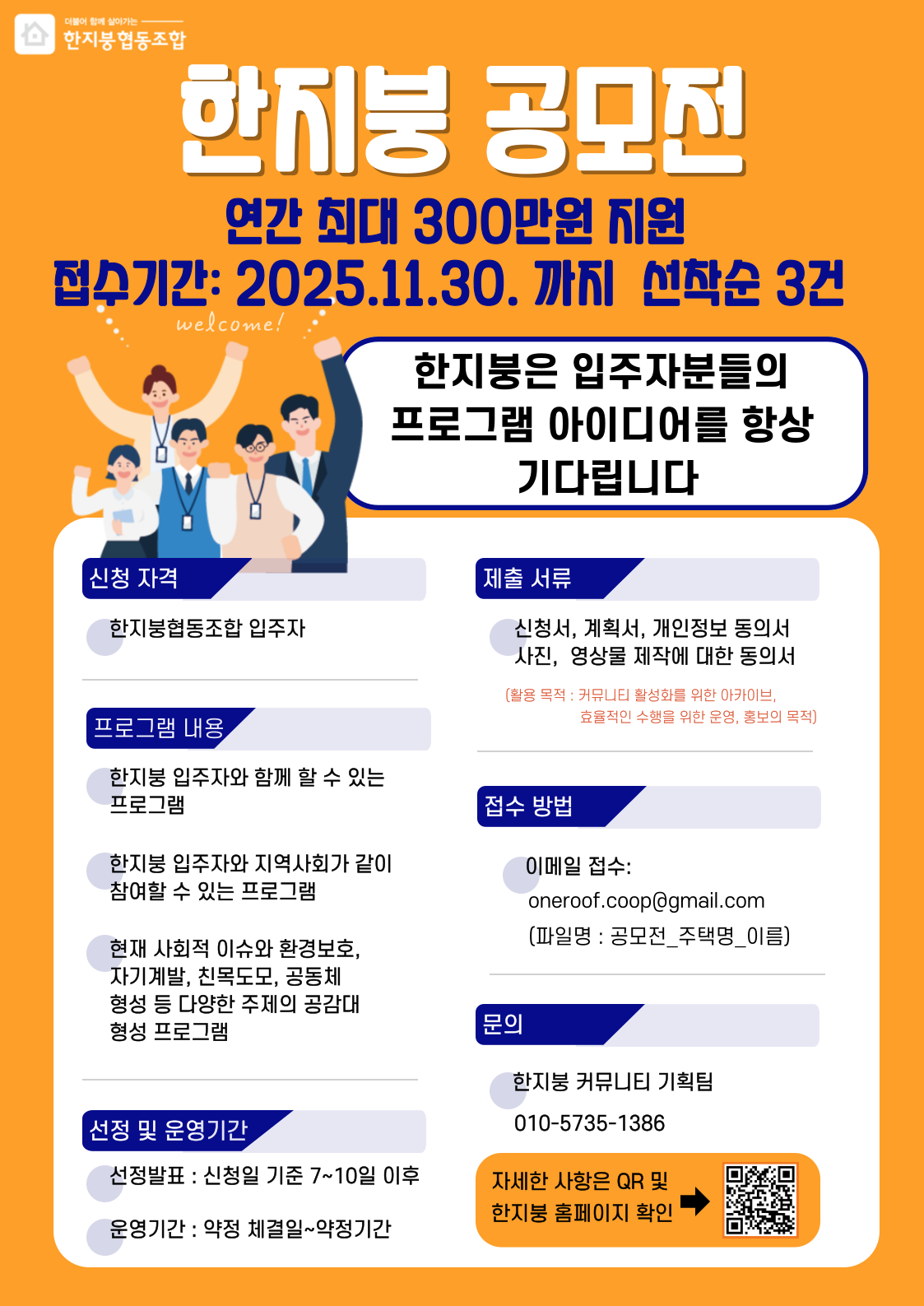 2025년 한지붕협동조합 지원 『한지붕프로그램 공모전』 2차 모집을 아래와 같이 안내해 드리오니, 각 주택 입주자는 모집 공고 내용을 확인하시고 적극 지원 바랍니다.