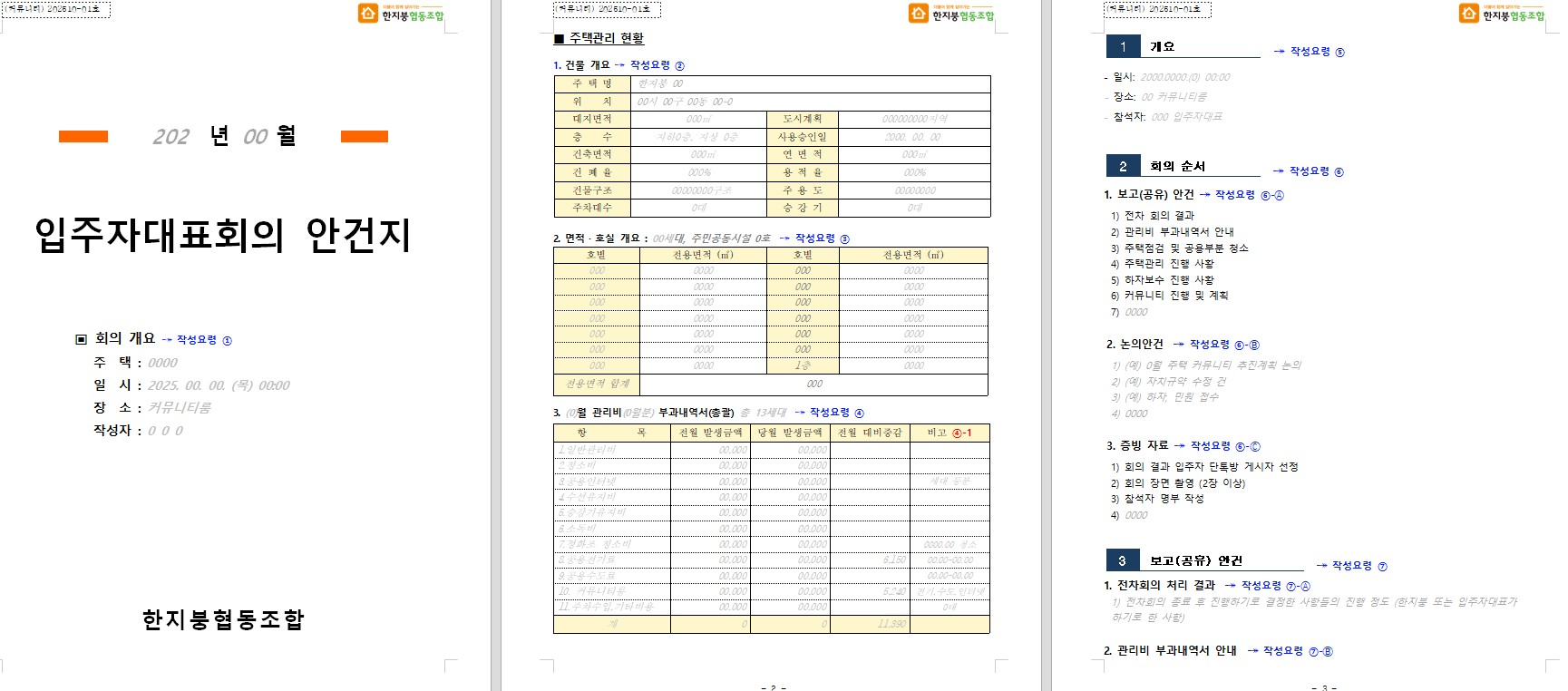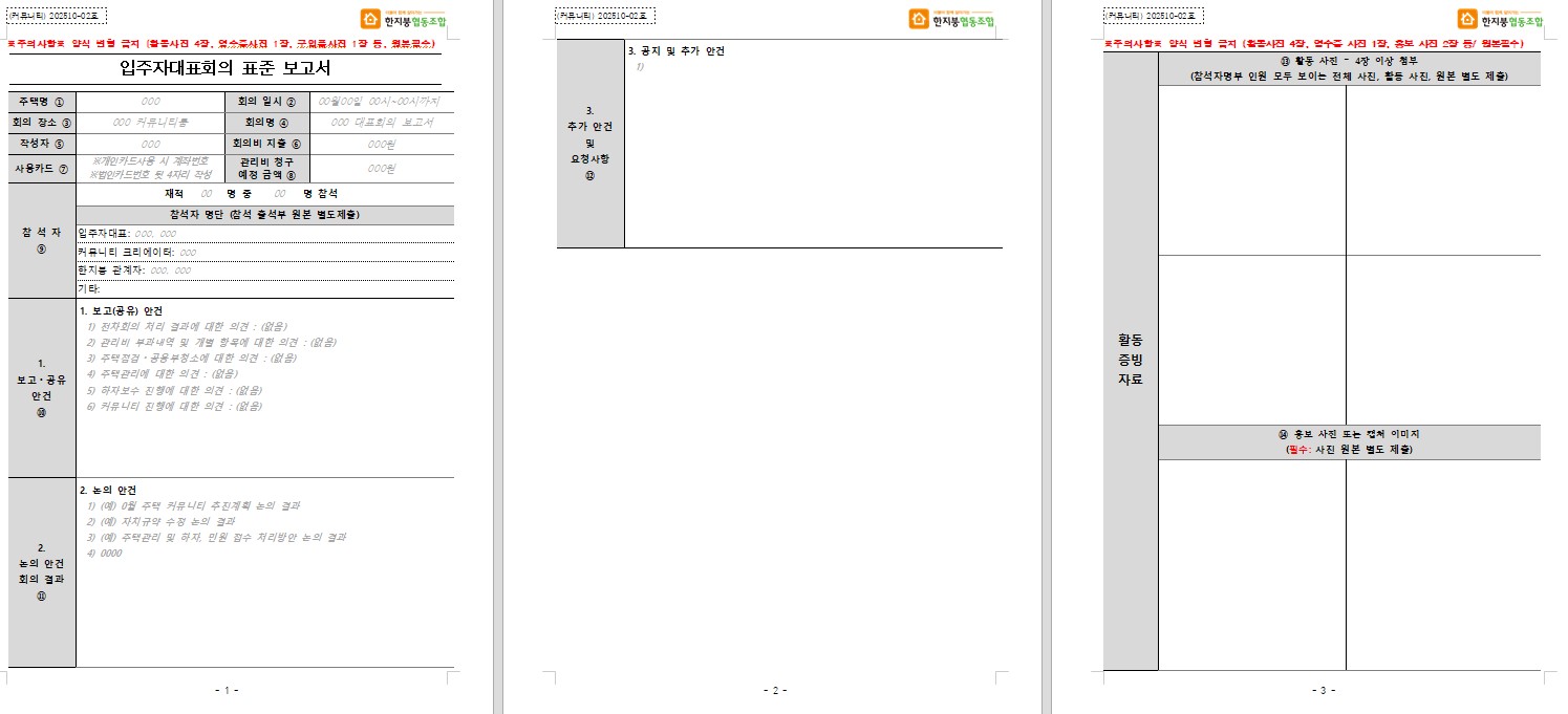 한지붕 커뮤니티 입주자대표회의 표준안건지, 표준 보고서 양식입니다.(한글 파일)