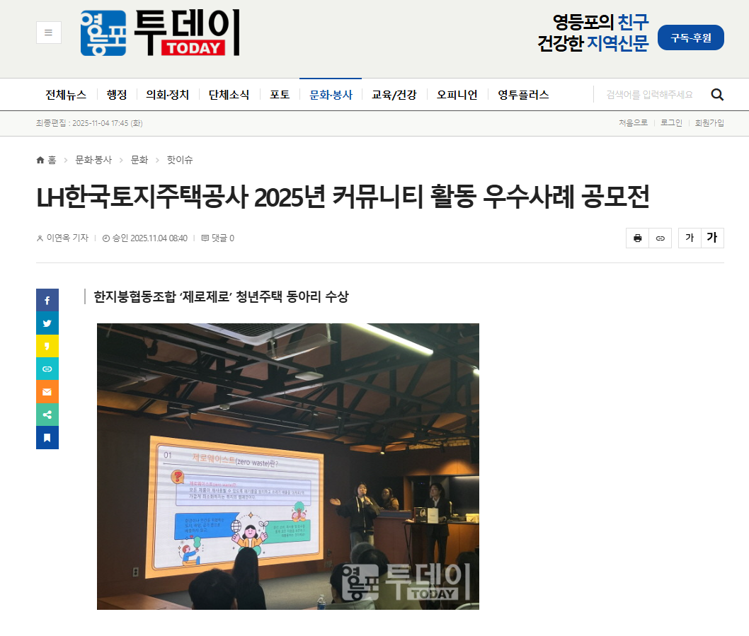 한지붕협동조합이 청년 주택 입주자들도 공모전에 참여한 바, 생활 쓰레기를 최소화시켜 환경을 보호하는 “제로웨이스트”를 실천하는 방이동 청년주택 동아리 「제로제로」 청년 모임이 장려상과 금일봉을 수상하게 되었습니다.